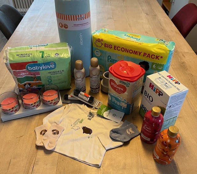 Unter den gespendeten Artikeln befinden sich unter anderem Babywindeln, Schnuller, Lätzchen etc.